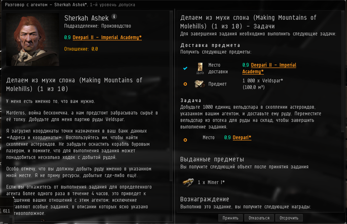 Внимание! Если Вы ещё не создали персонажа, то лучше создайте его по приглашению. В таком случае Вы окажетесь счастливым обладателем некислого буста в виде свободных для распределения 1 000 000 скилл пойнтов (очков изучения). Адрес приглашения: Приглашение в EVE Online. Achtung! - Все слова, которые могут быть непонятны подписаны (№*) , в конце я подробно их расшифровываю, иногда с примерами.Так что прежде чем писать гневный коммент, прочтите их. Что ж, в прошлом посте мы остановились на потере единственного боевого корабля. Но зато нам выдали вентурку, а это значит, что мы летим заниматься лучшим занятием в EVE Online, с которым не сможет сравниться ничего, даже самые массовые баталии... Мы летим копать вельдспар! Тройное ура, сему событию. Буры поставлю EP-S Gaussian Scoped Mining Laser, ибо это лучший выбор.