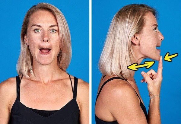 1. Ковш. Начните с самого простого упражнения. Широко откройте рот. Вогните нижнюю губу вовнутрь. Закройте рот, одновременно опуская голову. Каждое движение должно быть медленным, чтобы работали мышцы подбородка. Сделайте минутный перерыв, прежде чем переходить к следующему упражнению. 2. Поцелуй в потолок. Стоять на стуле и целовать потолок не надо, но движения очень похожи. Откиньте голову. Вытяните губы, как будто целуете кого-тою Это простое упражнение задействует мышцы шеи. 3. Касания носа. Высуньте язык. Старайтесь коснуться им носа. Если вы подложите под подбородок руку, то почувствуете, как растягивая подбородка. 4. Сопротивление. Это упражнение можно делать в любом месте. Сложите руки в кулаки и подложите под подбородок. Надавливайте подбородком на кулаки в течение 5 секунд. Такое сопротивление напрягает мышцы и помогает избавиться от двойного подбородка. 5. Идеальный овал. Последнее упражнение не только убирает двойной подбородок, но и п