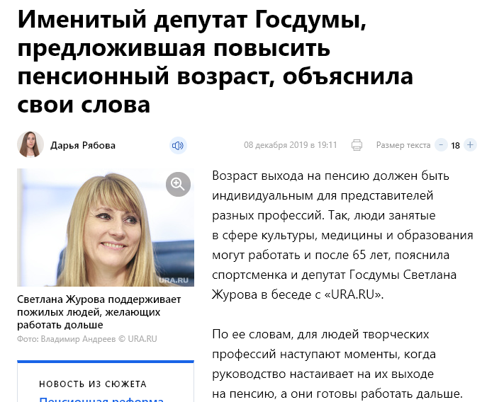 Не успели мы отойти от прошлогоднего повышения пенсионного возраста для россиян как на горизонте замаячила новая беда. Как стало известно на днях народный депутат госпожа Светлана Журова взорвала общество своим заявлением: Возраст выхода на пенсию должен быть индивидуальным для представителей разных профессий. Так, люди занятые в сфере культуры, медицины и образования могут работать и после 65 лет По её словам, много знакомых этой избранницы народа умоляют госпожу Журову внести законопроект о повышении пенсионного возраста хотя бы для отдельных категорий. для людей творческих профессий наступают моменты, когда руководство настаивает на их выходе на пенсию, а они готовы работать дальше. В таких случаях стоит увеличить пенсионный возраст. Сразу следует признать, что госпожа Журова призывает так же снизить пенсионный возраст для некоторых профессий. Например, для шахтеров. Странно что она не знает про выход на пенсию по вредности производства. То есть у нас, итак есть профессии, где