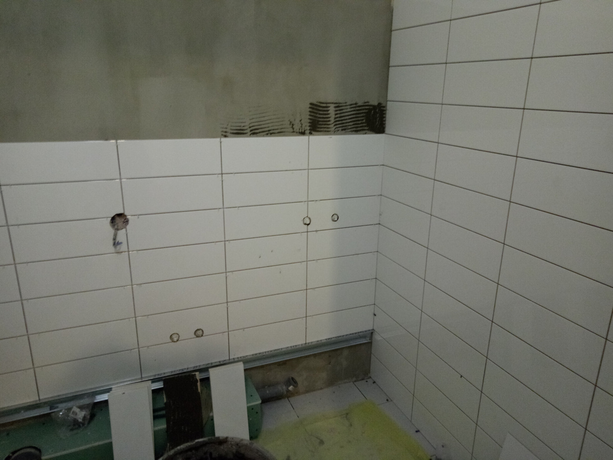 В фирменном салоне вышеупомянутого производителя такая плитка стоила на 20% дороже, чем мы купили в Максидоме. Поэтому совет: всегда предварительно мониторьте цены в вашем городе. Плитку клали не по всем стенам и не на всю высоту, а на 2 метра. Получилось так, что одна стена осталась совсем без плитки. Всё остальное под покраску. На пол выбрали тоже светлую плитку. Пол в ванной от застройщика был не идеально ро