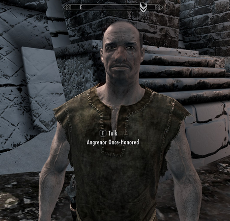 На улицах Виндхельма можно встретить одного из самых странных нищих Скайрима, а именно некого норда по имени Ангренор Награжденный, который при первой встрече рассказывает нам о своей нелегкой судьбе. "Я был одним из лучших солдат "Братьев Бури", пока однажды мне не вогнали меч в грудь. С тех пор как эти имперские ублюдки напали на меня сзади и раняли мне трудно дышать. Хорошо хоть пить не трудно." И на самом деле при проведении русской локализации его имя было переведено неправильно. Ведь на английском оно звучит как Ангренор "Некогда почитаемый", что говорит не о том что он получил награду, а о том, что он ранее был значимым членом в обществе. Но как бы то не было кривая локализация это не то, о чем я хотел рассказать. "О боги какая жестокость" - прохожая с улиц. Ангренора рано или поздно убивают прямо в городе, где мы проходя мимо видим уже только его мертвое тело, при том что на момент его убийство серийный убийца Виндхельма может быть уже за решеткой, и из за чего можно сдела
