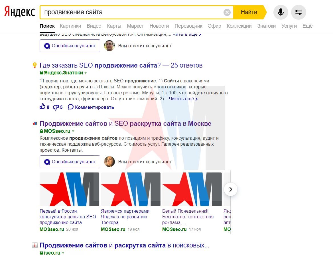 Поисковая выдача – это страница с перечнем сайтов, которая формируется поисковой системой в ответ на запрос пользователя. На скриншоте ниже Вы видите пример как выглядит такая страница, которая была сформирована Яндексом на запрос “продвижение сайта”: