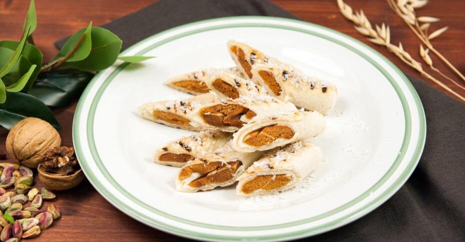 Выкладываем кусочки пастилы, сворачиваем в рулет, слегка обжариваем на сковороде-гриль.