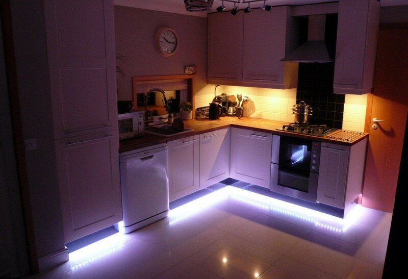 - Светодиодная подсветка пола. Светодиодная лента обладает массой преимуществ – выпускается в различных цветовых вариантах, потребляет малое количество энергии, работает долго и без сбоев, может быть установлена самостоятельно. С помощью светодиодной ленты хорошо выделять пол по периметру, устанавливать в нижнюю часть напольных тумб.