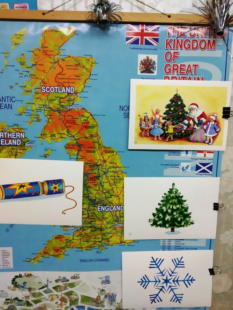 Мы свое рабочее место украсили еще первого декабря. Поэтому и на занятиях у нас вовсю процветает новогодне-рождественская тематика. Я вот соответствующие картинки натыкала, где только можно. На карте Великобритании, например. Но я сейчас не об этом. А о том, что я столкнулась с полнейшим невежеством, причем ладно бы у начальной школы. У старшеклассников! Нет, дату Нового Года знают все. Начинаю спрашивать про Рождество. Знаете, я удивилась: даже насчет нашего Рождества показания колеблются. В частности, озвучивались такие даты, как 1,2 и 8 января. Но хоть помнят, что в январе. Спрашиваю про католическое. Здесь еще хуже: 26,29 и 31 декабря, 7 января и даже вариант «оно совпадает с Новым Годом». Кстати, почему Рождество – многие тоже смутно знают. «Вроде кто-то там родился». *** Теперь вернусь непосредственно к английскому. Показываю вот эту картинку, уточняю, что это именно Рождество, не Новый Год. Пытаюсь выяснить, как по-английски. Мне так: - Мэрикристмас. Угу, теперь даж