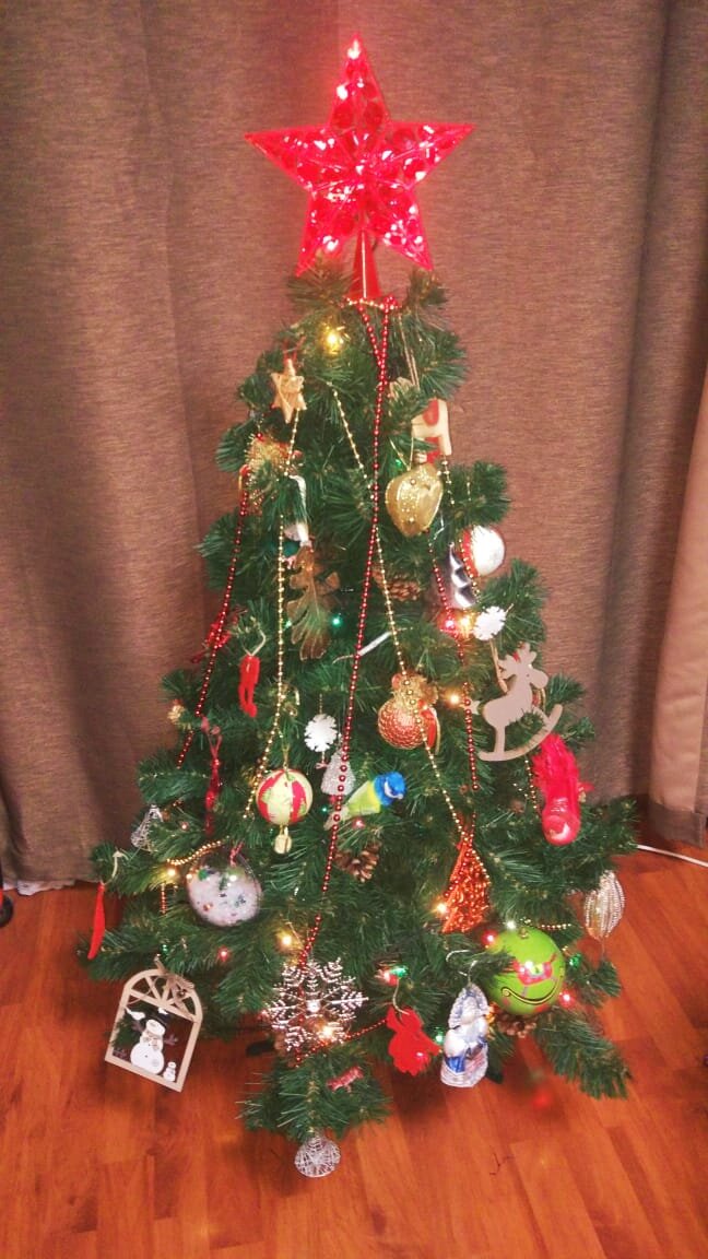 Когда-то я любила наряжать живую ёлку. Она по-новогоднему пахнет и вообще экостайл. Были времена, когда мне вообще не хотелось ёлку, я ставила в вазу ветки багульника с цветами и еловые лапы. Бывало я делала ёлку из бус на стене, из мишуры, намотанной на картонный конус. Как-то раз я наряжала деревянную ёлку, а однажды вообще связала ёлку крючком. Но когда в доме ребенок, начинаешь учитывать многие моменты. Главный: ребенку нужен праздник. Не менее важный: праздник должен быть безопасным. Поэтому, теперь у нас искусственная ёлка и небьющиеся игрушки. И когда в прошлом году мы всю эту неземную красоту уронили, два раза, то потери составили всего ничего: рог золотого оленя и луч снежинки. В этом году уронили, пока, только звезду. Звезда, конечно, уже не будет такой, как прежде. Но из далека не заметно, главное светится. Самый напряжный для меня момент - распутать гирлянду. Как ее аккуратно не скручивай, раскручиваться она потом все равно не хочет. Зато развешивать игрушки одно удовольст
