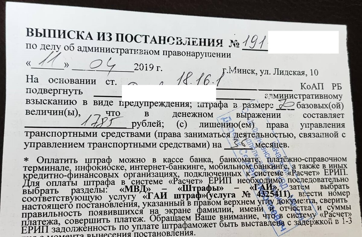 Например, вы привлечены к административной ответственности по ч.1 ст.18.16 КоАП Республики Беларусь и на вас наложено административное взыскание в виде штрафа в размере 70 базовых величин с лишением права управления транспортными средствами на 3 года.
