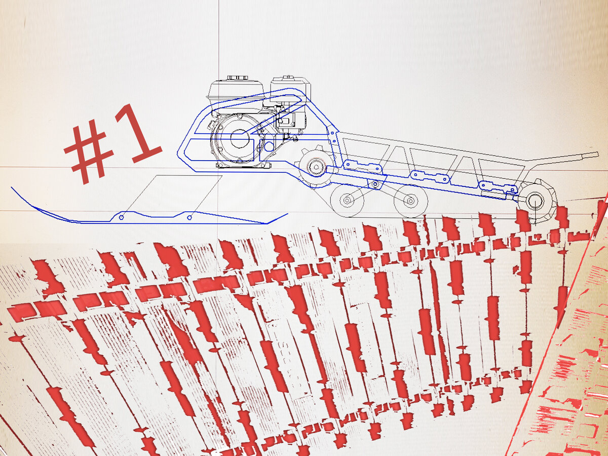 Недавно увидел в интернете рекламу "Мотосноуборда". Данный аппарат меня заинтересовал. Посмотрел видео от производителя, где ребята резво катаются на этой штуки. Решил, что мне такой срочно нужен, и я его сделаю. Но немного углубившись в механику, стало ясно, что для покатушек на сноуборде с двигателем, крайне необходимо много снега - хорошего пухляка толстым слоем. Управляется он исключительно переносом веса и кантовкой, и к тому же имеет склизовую подвеску. На дворе декабрь, а за окном не снежинки. +6 и дождь. Вообщем зима в нашем регионе скудная, и снега маловато. Ну не бросать же идею. Взялся за создание более универсальной конструкции. Технические требования: Первым делом взял гусеницу шириной 380 мм. Данная гусеница имеет несколько вариантов длинны. Так-как компактный размер в приоритете , то мой выбор - самая короткая. Важный момент - это пятно контакта гусеницы. Собрав примитивный чертеж в реальных размерах , я задал необходимый угол атаки , стараясь оставить наибольшую пл