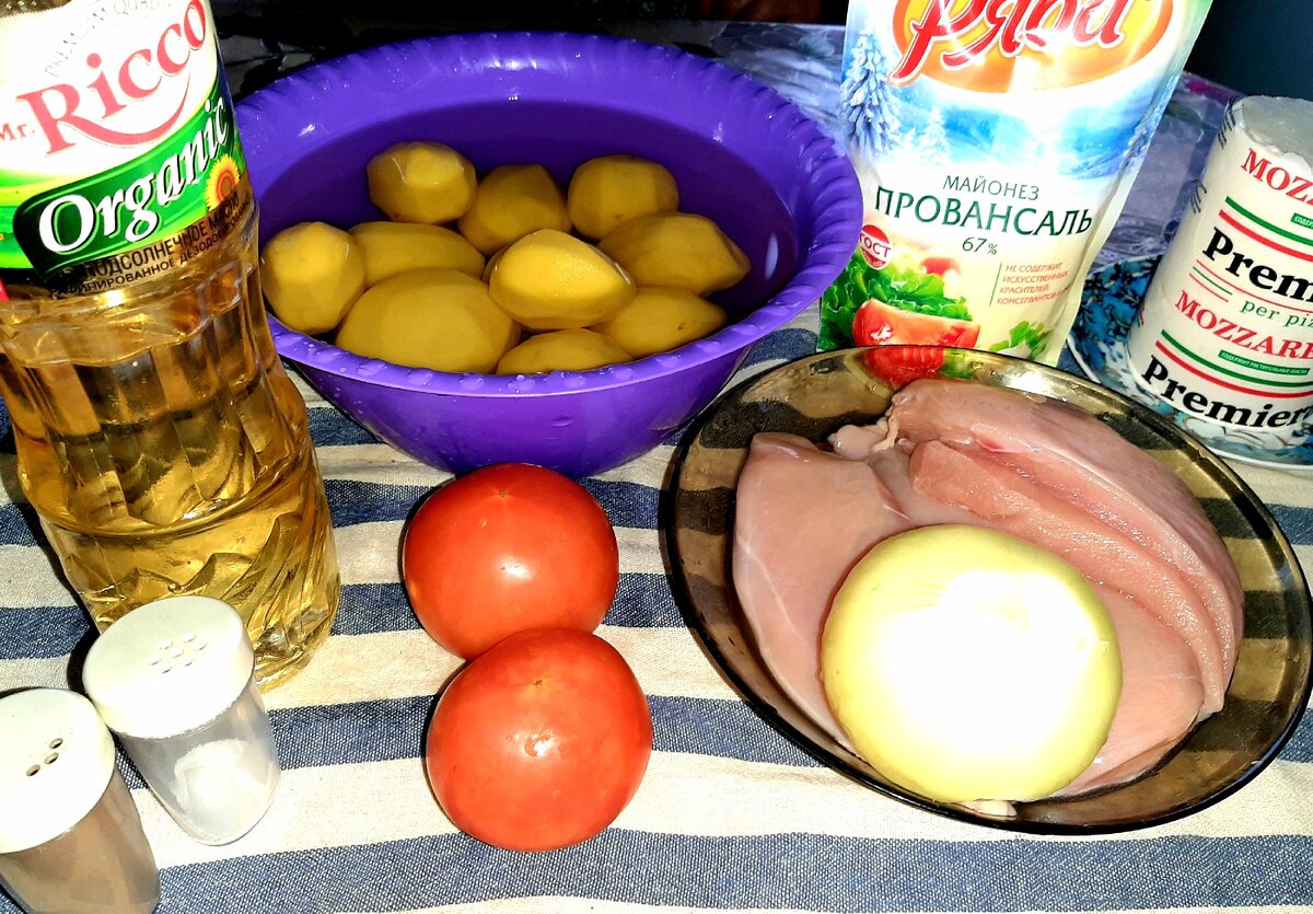 Ну что, покулинарим? Сегодня хочу приготовить для Вас мою версию всем знакомого блюда, под названием "Мясо по-французски ". По этому рецепту блюдо приобретает совершенно другой вкус, и на мой взгляд так его готовить даже быстрее, хотя на этот счёт мнения разные. Итак, к составляющим. Ингридиенты указаны на 6-7 достаточно больших порций готового блюда. Начнём с мяса. Его нужно порезать небольшими кусочками. Затем его нужно обжарить с добавлением небольшого количества растительного масла до золотистого цвета. После обжарки мяско нужно выложить в форму для запекания ровным слоем, немного посолить, поперчить и слегка смазать майонезом. Кстати, форму смазывать не нужно, на мясе остаётся немного масла, этого достаточно. Следующим шагом режем картофель крупной соломкой, и также обжариваем до полуготовности. Затем выкладываем сверху на мясо. Слегка солим, перчим. Режем лук полукольцами. Выкладываем в форму. Режем помидоры тонкими ломтиками и выкладываем на лук. Слегка покрываем майонезо
