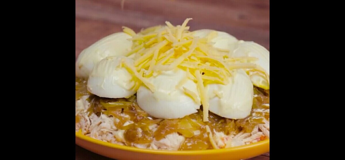Рецепт взяла из интернета и тут же решила опробовать Нам нужно 5 яиц Луковица 2 шт Вареная курица 250гр Картофель вареный 4 шт Морковь вареная 2 шт Сыр твердый 100гр Яйца разрезаем на половинки достаем желтки растираем их с майонезом фаршируем половинки Лук обжариваем с сахаром Тарелку смазываем майонезом и выкладываем слоями 1й слой картофель 2й слой вареная морковь 3й слой курица Жареный лук После каждого слоя сетка майонеза, сверху выкладываем половинки яиц и посыпаем сыром. Салат готов ! Ну на мой взгляд салатуне хватает чего то контрастного для вкуса . Что то типа маринованого огурчика Оставайтесь со мной дальше больше
