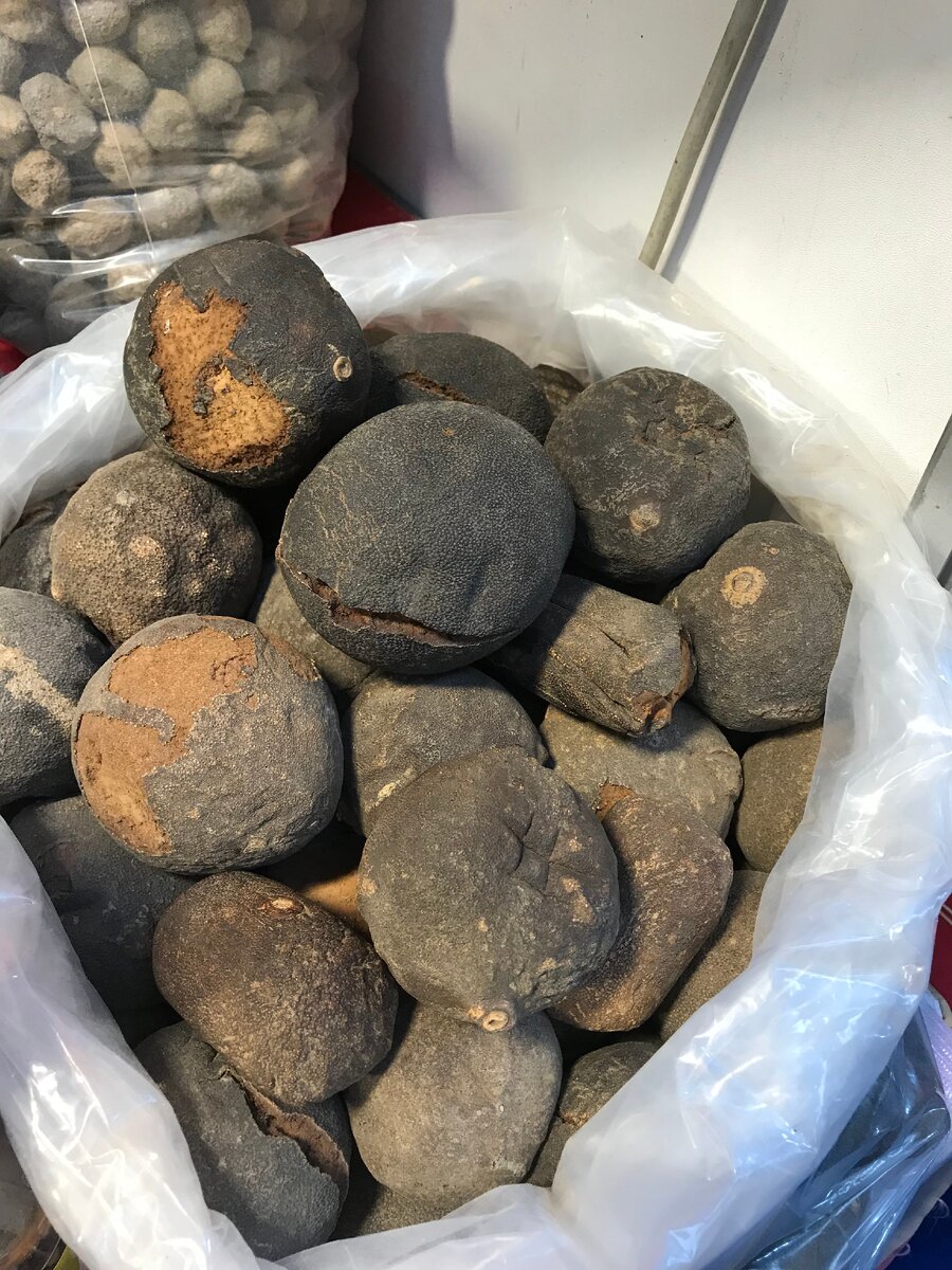 На одном из прилавков я увидела странный черный, засушенный плод. Продавец рассказал, что это каменный апельсин и что его применяют при лечении разных заболеваний горла: простуде, астме, бронхите, кашле. На ощупь апельсин очень твердый и совсем не выглядит съедобным.