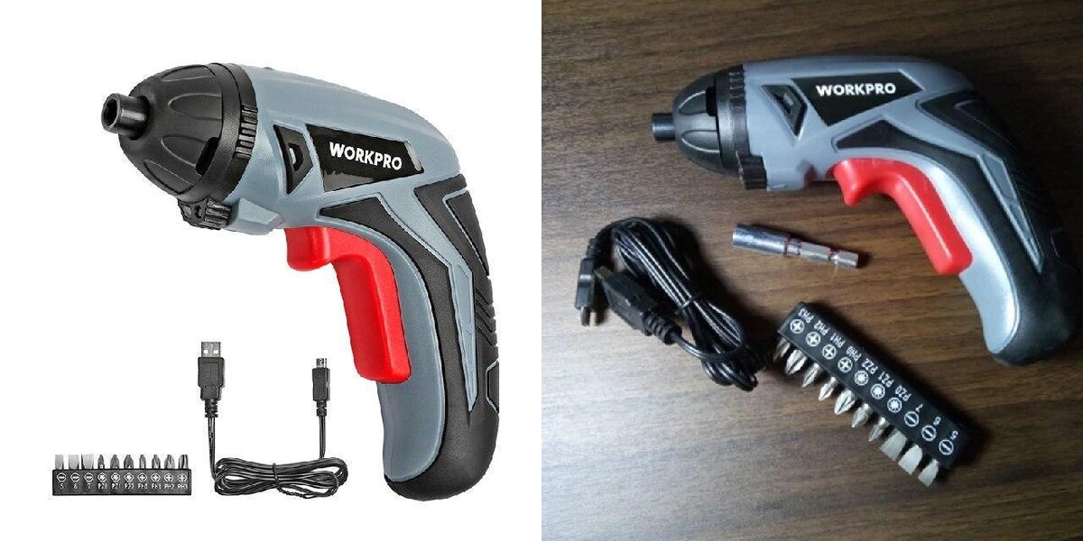 Компактная аккумуляторная отвёртка WORKPRO со светодиодным фонариком для работы в плохо освещённых местах. В комплекте есть набор бит и кабель для подзарядки.