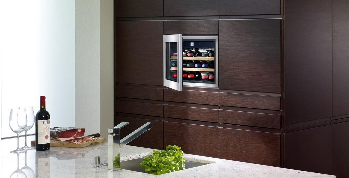 Отдельные модели специально рассчитаны на то, что их можно органично внедрить в кухонный гарнитур — в основном это относится к компрессорным холодильникам. Забор воздуха у них располагается снизу, поэтому их можно устанавливать в мебель без зазоров по бокам. Об этом критерии стоит задуматься, если вы покупаете винный шкаф на стадии установки кухонного гарнитура. Если же вы хотите приобрести холодильник для вина на уже оборудованную кухню и не планируете его встраивать, то этот момент для вас не будет имеет большого значения.