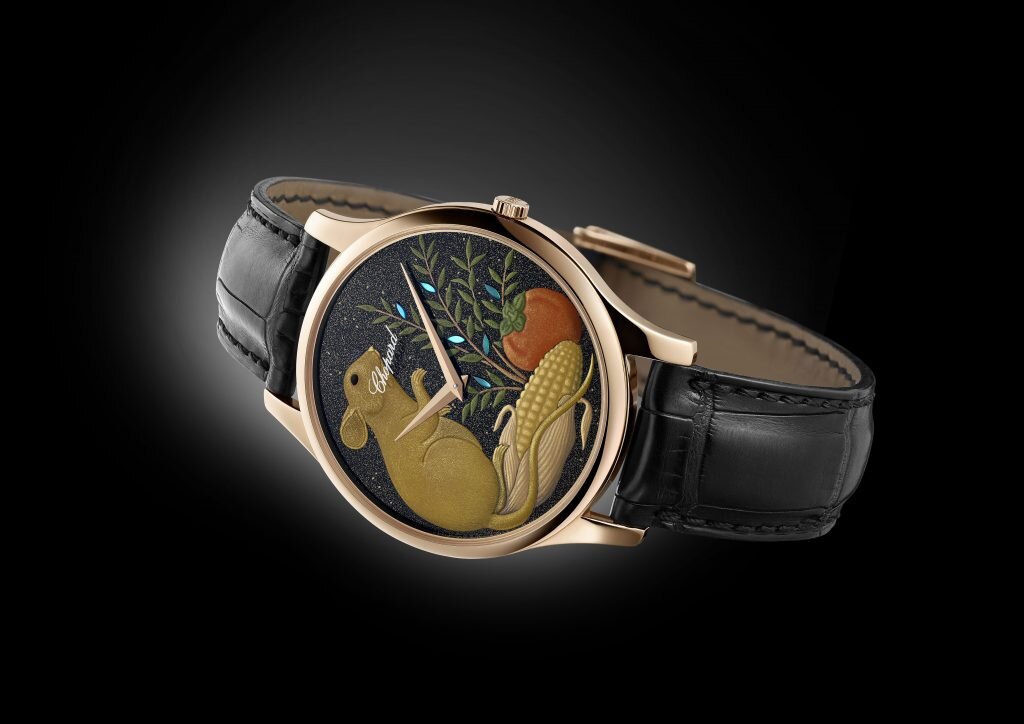 Лимитированная серия 88 экземпляров. Сохраняя верность традиции, компания Chopard представила «новогоднюю» модель L.U.C XP Urushi Year of the Rat, созданную с применением японской лаковой миниатюры уруши. Выпуск лимитирован серией 88 экземпляров. Часы доступны только в бутиках Chopard. Согласно одной из легенд китайской мифологии, когда Будда перед погружением в Нирвану призвал к себе животных, первой пришла крыса, взобравшаяся на буйвола (быка). Хитрый зверек вытеснил кота, лишив его места в календаре, отсюда и вечная вражда этих двоих. Год металлической Крысы наступит 25 января 2020 года и закончится 12 февраля 2021-го. Часы представлены в корпусе из розового золота 39,50 х 6,80 мм. Циферблат полностью сделан вручную. Сюжет картинки на циферблате пропитан символизмом. Покрытая золотом крыса стоит на початке кукурузы (символ изобилия) и смотрит на плод хурмы (символ долголетия). Рядышком дизайнеры изобразили что-то вроде букета, выдержанного в трех счастливых для крысы цветах: синем