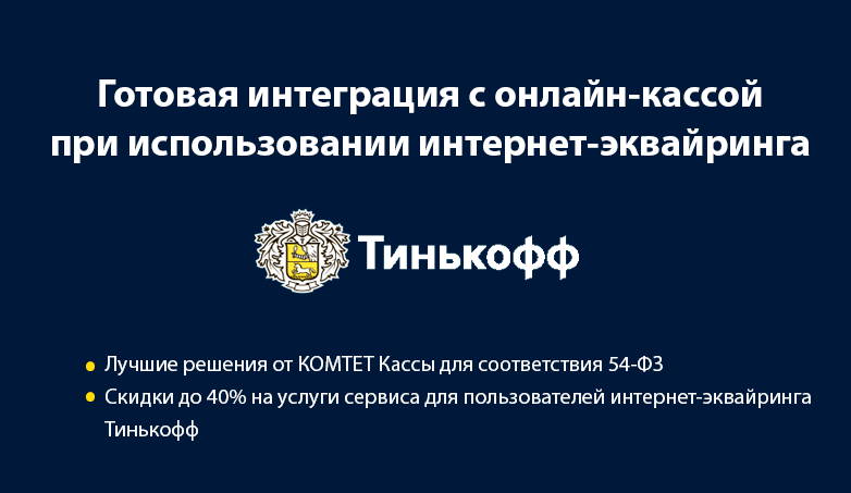 Для пользователей интернет-эквайринга Тинькофф действуют специальные цены на услуги сервиса КОМТЕТ Касса. Подробнее об интеграции и тарифах на промостранице: онлайн касса для клиентов Тинькофф.