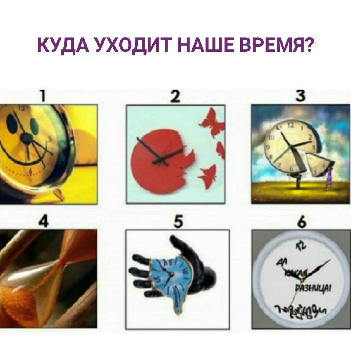 Время — самый ценный и невосполнимый ресурс. Умеем ли мы грамотно и рационально распоряжаться им? Ответ подскажет тест, который предлагаю сегодня пройти. 1. Посмотрите на картинку с изображением часов и выберите те, которые понравились больше всего. 2. Свой выбор зафиксируйте в комментариях. Больше тестов можно найти по #од_тесты #психологическиетесты #тестыонлайн #психологическийтест Ответы на тест⠀#од_тесты ⠀ 1. Вы стараетесь видеть везде позитив, находите счастье в мелочах. И это очень здорово! Главное, чувствовать себя действительно счастливым, а не казаться им🙂 ⠀ 2. Вы тот человек, который очень много думает прежде, чем что-то сделать. Это неплохо, но на на раздумья уходит много времени. Старайтесь сократить время между «решил» и «сделал»😉 ⠀ 3. Вы не любите тратить время на пустую болтовню, это может даже раздражать, когда кто-то пытается отнять у вас время. Но, не будьте так сильно строги по отношению к окружающим🤝 ⠀ 4. Все Ваши мысли поглощены прошлым, Вы этим живете
