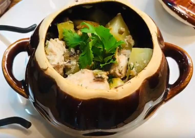 Рецепт картофеля с курицей и сливочно-грибной заправкой, приготовленного горшочках. Все очень просто, блюдо получается ароматным и как-то по-особенному вкусным. Для приготовления нам понадобится: 1 кг куриного мяса (бедро) 1.5 кг картофеля 1 луковица 400 гр шампиньонов 400 мл 10 % сливок 3 ст. ложки растительного масла без запаха. 10 грамм сливочного масла 1 лавровый лист соль и чёрный перец по вкусу Мясо освобождаем от кожи и костей, нарезаем крупными кусочками. В целях экономии времени, можно взять куриную грудку. Мясо предварительно замаринуем - добавим черный перец по вкусу и пол-чайной ложки соли. Хорошо перемешаем и отставим в сторону. Лук нарезаем мелкими кубиками. Хорошо промытые и обсушенные шампиньоны, также режем кубиками. На разогретую сковороду наливаем растительное масло и кладем кусочек сливочного масла. Когда масло разогрелось, кладем шампиньоны и обжариваем их, периодически помешивая Очищенный картофель нарезаем крупными кубиками, кладем в миску, до