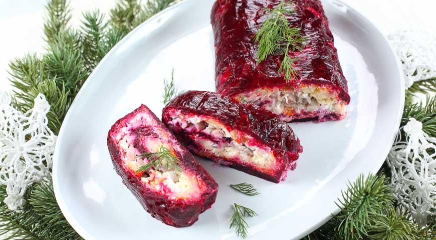 4️⃣Начинаем собирать салат. Стелим пищевую плёнку. Первым слоем выкладываем свёклу,солим ,перчим и смазываем майонезом. Далее по очереди ,то же самое с морковью и картошкой.Поверх картошки выкладываем сельдь присыпав маринованным луком.