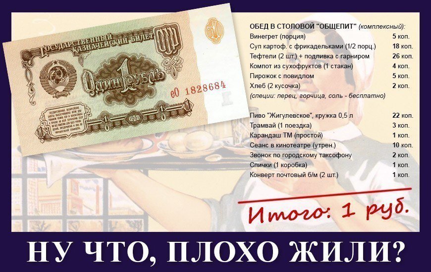 Ещё через 5 лет ему уже 20 лет. Он студент. Получил стипендию. Пошёл в магазин, отдал в кассу рубпь. Пробил чек на буханку хлеба (12 копеек), плавленый сырок за 10 копеек, бутылку пива (37 копеек), 100 грамм "докторской" (23 копейки). Получил сдачу, сложил всё в портфель. Подумал, почесал за ухом, засмеялся, перешёл на другую сторону улицы и купил мороженое "эскимо" за ..... 11 копеек. На оставшиеся 7 копеек купил газету "Комсомольская правда" и на метро поехал в общагу.Застой... Тоска, что тут скажешь? Ужас!Застой! Тоска смертная...