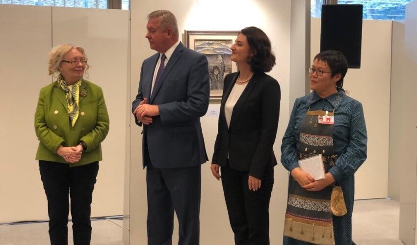 Выставка уйльтинской мастерицы, которая рисует картины на рыбьей коже, открылась во Дворце Наций в Женеве в рамках проведения 8-го Форума ООН по вопросам предпринимательской деятельности и прав человека. Организаторами выступили Постоянное представительство Российской Федерации при ООН, Глобальный договор ООН. Уйльта, малочисленный народ из числа коренных жителей Севера Сахалинской области, используют рыбью кожу для изготовления хозяйственной утвари, одежды, обуви, сумок и других предметов быта. Но Вероника вдохновилась уникальностью материала и воплотила свои творческие задумки в виде изображения сцен из традиционной жизни и устных сказаний своего народа. На выставке представлены десять работ художницы. — Кожа рыбы настолько живописна и уникальна, как отпечатки пальцев человека, что даже не нужно ничего на ней рисовать, лишь добавить несколько штрихов. Это удивительный материал, с которым я не могу расстаться уже более 30 лет. Чаще готовлю его сама, но иногда также приносят люди, — ра