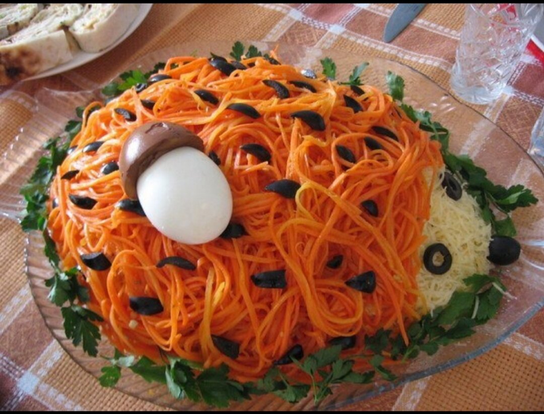 Салат выкладываем на плоское блюдо слоями в форме ёжика, каждый слой тщательно промазывая майонезом: 1 слой - куриное мясо, 2 слой - обжаренные с луком грибы, 3 слой - отварные яйца, 4 слой - корейская морковь.