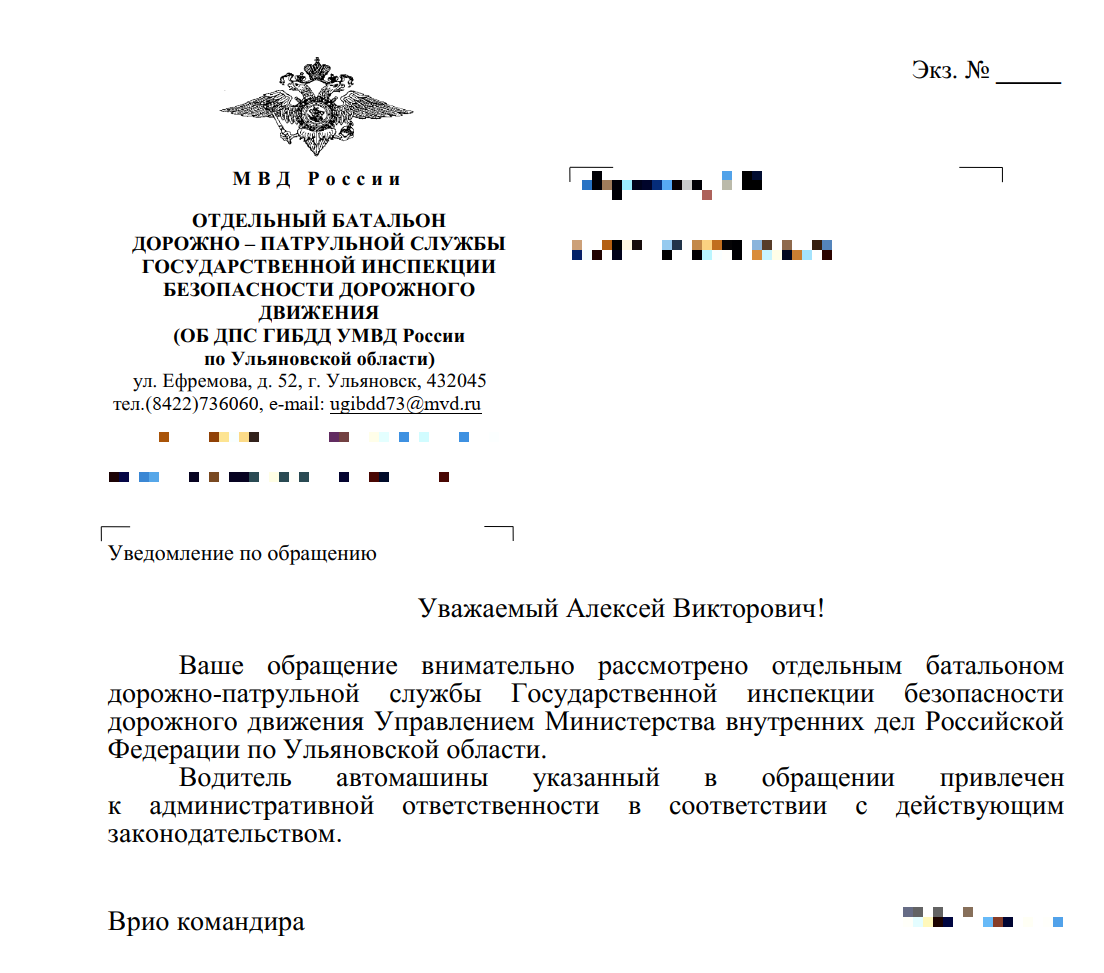 В спокойной обстановке дома я слил ролик с регистратора на комп, аккуратно обрезал, оставив саму суть происшествия, открыл сайт ГИБДД и написал в форме обращения следующий текст: