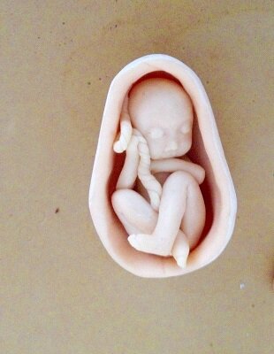 Как выяснилось, подобное чувство отвержения она испытывала и ранее. Самые первые ощущения увели Надежду к пренаталу, когда она находилась в утробе. Девочка была нежеланна своей матерью. Клиентка изобразила в песочнице свое состояние отвержения фигуркой младенца в матке. Она ощущала это пространство как мрачное, холодное и зловещее место из которого хотелось поскорее выбраться. Песочная композиция №1: