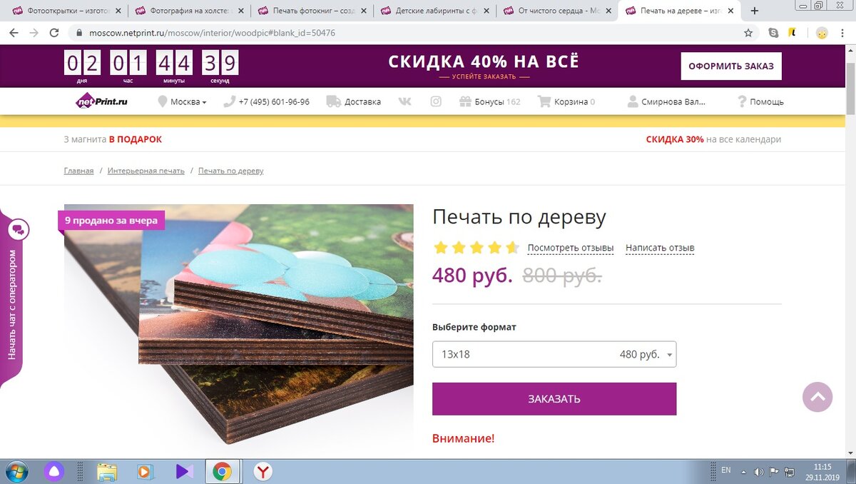 Популярный сервис полиграфической продукции предлагает шикарную скидку 40% в Черную пятницу. Срок действия - 29 ноября - 01 декабря 2019г. Распространяется почти на все услуги (кроме доставки) и продукцию Netprint. В акции не участвуют подарочные сертификаты, детские именные книги, 25 фото Почтой, магниты и подарочные коробки. Что же можно выгодно приобрести в этом магазине? Отличным подарком к новому году может стать сувенирная продукция с вашим уникальным дизайном, приобретенная в дни распродажи. Друзьям отлично подойдут кружки с прикольными надписями или пазлы с совместным фото. Цена на них начинается от 253 р. Относительно новый продукт - печать фото на дереве. На мой взгляд напоминает кухонную разделочную доску. Забавно было бы распечатать фотографию ненавистного вам человека и резать на ней например овощи :) Очень советую воспользоваться предложением NetPrint и подготовить открытки к Новому году с собственным уникальным дизайном. Такое удовольствие будет стоить от 30 рублей, что,