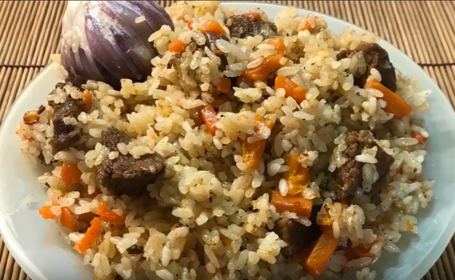 Это среднеазиатское блюдо, давно стало своим на нашем столе. Попробуем его приготовить без очага и дров, на обычной городской кухне Берем 700 г. мяса говядину, телятину или баранину. 2 средние луковицы 4 средние моркови 900 г. риса (лучше Басмати) 1 головку чеснока 200 мл растительного масла приправы соль, черный и красный перец готовая приправа для плова (лучше взять на рынке) Сначала надо сделать всю нарезку, потом этим заниматься будет некогда. Кусочки мяса не должны быть слишком мелкими Нарезаем лук. Можно делать это полукольцами. Главное - лук не нужно нарезать слишком тонко. Морковь ни в коем случае не трите на терке, наоборот, надо нарезать крупными брусочками, тогда она не разлезется. В разогретый казан, наливаем масло. Масло надо хорошо нагреть. До появления легкого дымка. Опускаем в казан лук и слегка перемешиваем. Когда лук обжарился и стал прозрачным, добавляем к нему нарезанное мясо. Перемешиваем и не закрываем, нужно чтобы мясо слегка обжарилось. Пока м