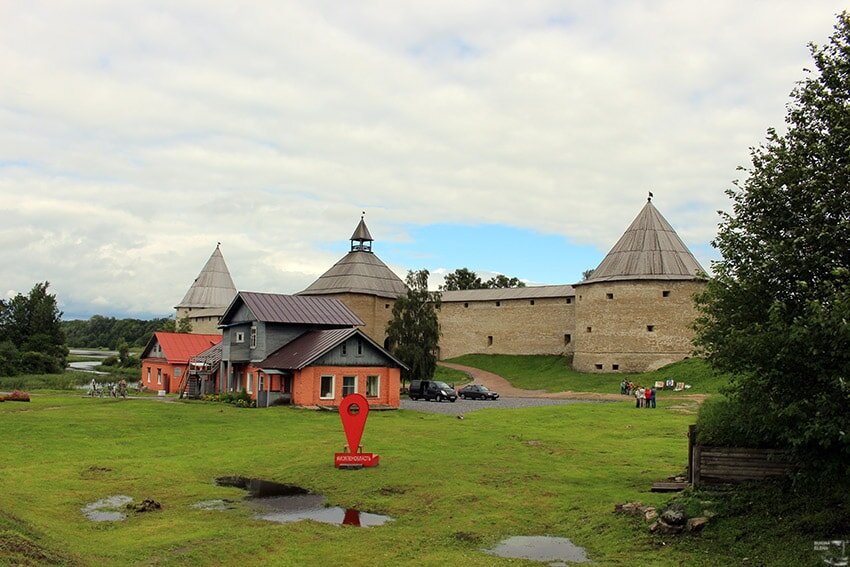 Крепость расположена на стрелке, там где река Елена впадает в Волхов. Завидев мощные башни крепости уже издалека, мы направились прямиком в ее сторону. Автомобиль поставили у дороги, ибо никаких парковок у стен не предусмотрено.