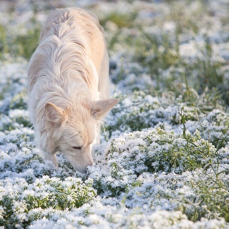 Такую диковинку мы видели впервые.⠀Мороз и влажность раскрасили траву на нашем любимом поле для прогулок в сказочный цветочный белоснежный ковер.