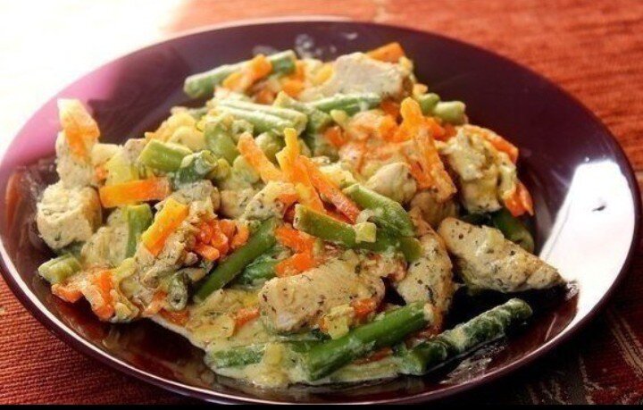 Курица со стручковой фасолью и овощами в сливочном соусе