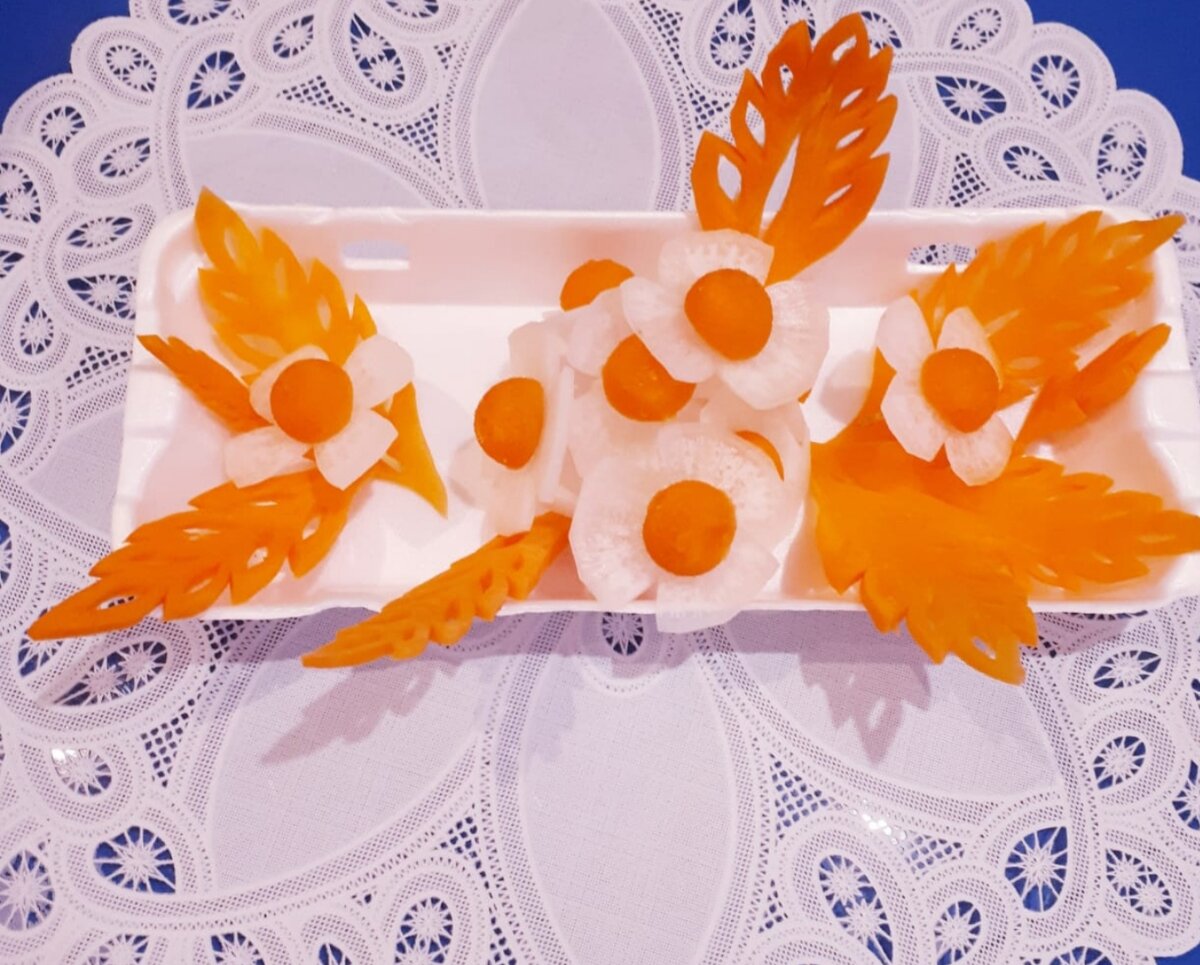 Когда в магазине покупаю продукты, всегда смотрю, что можно из них вырезать, цветы или вазу. Редька дайкон у меня дома лежит, решила морковь докупить. Для карвинга я всегда использую ножи из нержавеющей стали- они меньше всего окисляют продукт. Сначала проверяю ножи, чтобы они были острые, потом чищу морковь и редьку дайкона. Из редьки вырезаю тоненькие кружочки, потом с помощью ножниц вырезаю цветы и кладу в холодную воду и ставлю в холодильник. Для стебля из моркови вырезаю маленькие полу кружочки, также вырезаю цветы и листья, далее кладу в холодную воду и ставлю в холодильник на полчаса. Через полчаса вытаскиваю из холодильника и начинаю оформлять композицию. Сначала выкладывала цветы из редьки с листьями из моркови. Вроде просто, а так мило и нежно. На день матери дочь подарила цветы в красивой деревянной подставке и я решила попробовать поставить свою композицию из карвинга туда. Я вообще никогда не выкидываю корзинки плетенные, подставки, коробочки, потому что знаю, что могут п