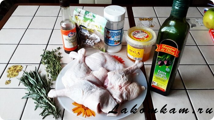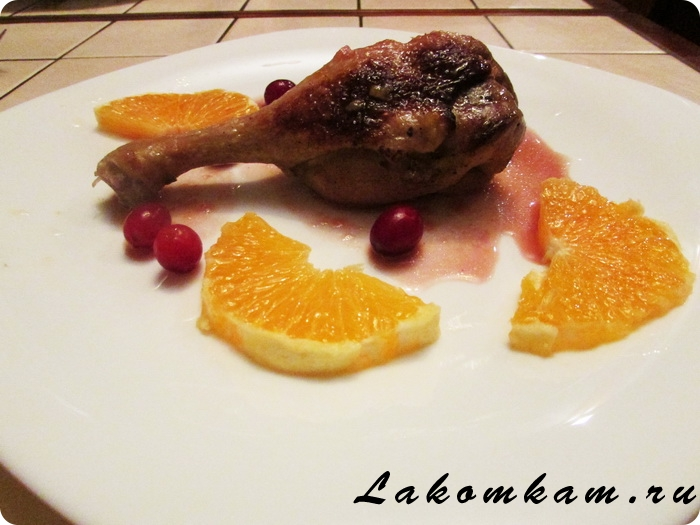 Ингредиенты: утиные окорочка – 4 штуки; оливковое масло, мед, вустерский соус — для смазки; соль, перец, розмарин свежий, тимьян свежий — по вкусу; апельсин – 1 штука; клюква, сахар — по вкусу.