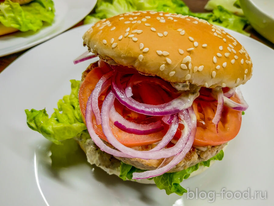 Добрый день! Давненько у нас фастфуда не было. Сегодня приготовим бургер с рыбой, но в этот раз не с целой как в случае с лососёвым бургером, а сделаем из тунцового фарша котлету. Продуктовый набор: Тартар можно купить готовый, а можно по-быстрому сделать из майонеза, маринованных огурцов или каперсов (если есть) и лимонного сока. Лук и помидор режем кольцами, имбирь и чеснок натираем на мелкой тёрке. Лук смешиваем с винным уксусом и небольшим количеством воды. Оставляем мариноваться минут на пять. Смешиваем фарш с чесноком, имбирем, соевым соусом и молотым перцем по вкусу. Отбиваем фарш о стол или миску, формируем две котлеты (удобно с помощью сервировочного кольца). Разогреваем на сковороде-гриль немного растительного масла и обжариваем котлеты по полторы минуты с каждой стороны и откладываем в сторону. На место котлет отправляем булочки и обжариваем по 30-40 секунд на сильном огне. Смазываем внутренние части булок тартаром и укладываем между ними салат, котлеты, помидор и кольца