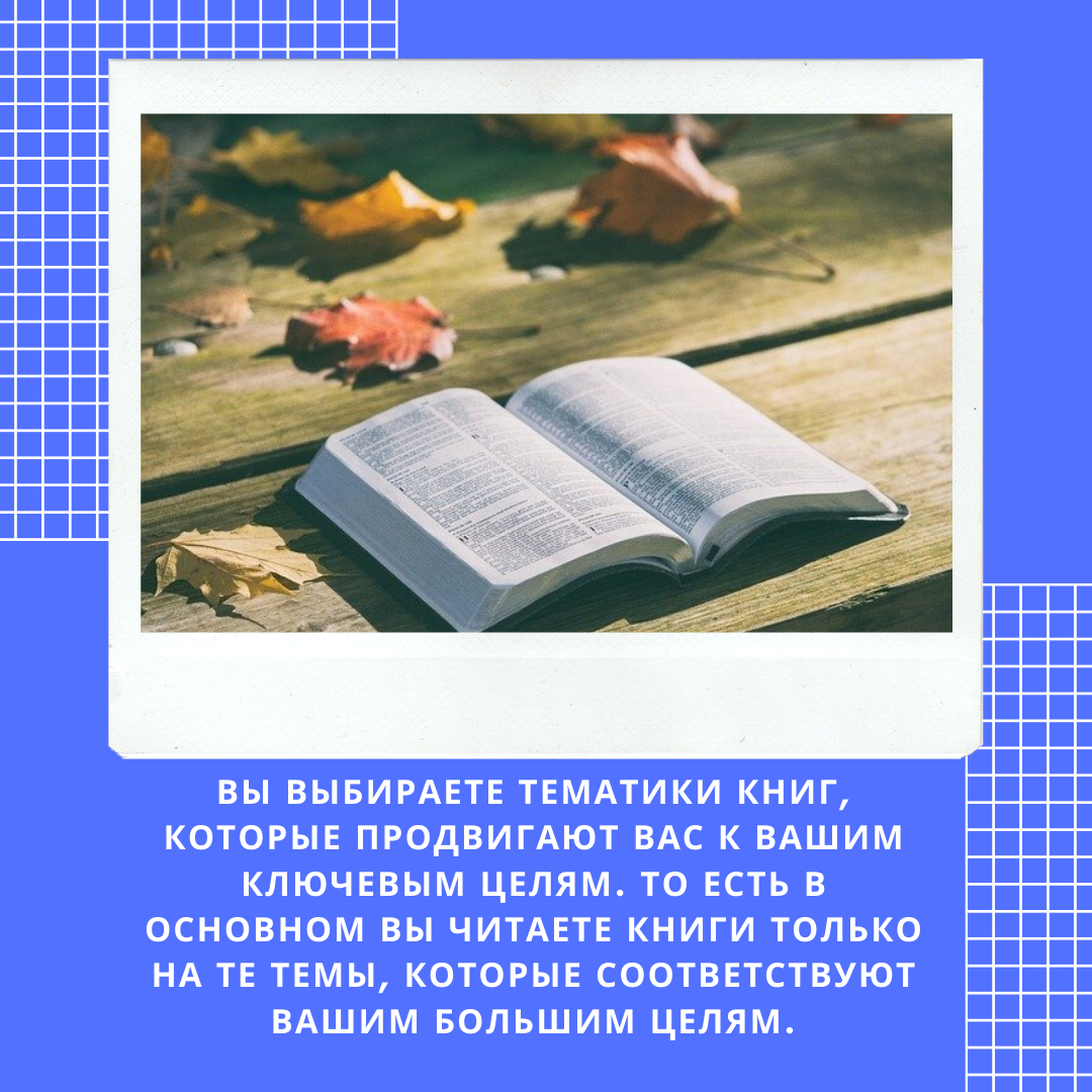 Совершенно великолепная привычка, которой я пользуюсь больше месяца, называется "книга в день". Почему она полезная? Что нужно сделать? Вы выбираете тематики книг, которые продвигают вас к вашим ключевым целям. То есть в основном вы читаете книги только на те темы, которые соответствуют вашим большим целям. Например: отношения, карьера, бизнес, личностный рост, духовный рост и т.д. Тут есть хитрость. Кто знает, как читать книгу в день? Это можно сделать благодаря конспектам. Причем конспекты можно как читать, так и слушать. Я слушаю. Один саммари в день занимает от 15 до 40 минут в день. Есть еще чит-код: слушать на скорости Х2. Тогда 15-минутное аудио становится, 7-минутным, а 40-минутное становится 20-минутным. Когда вы послушаете на скорости Х2, ваше ухо привыкнет через несколько книжек, и вы будете нормально воспринимать информацию. То есть это просто вопрос привычки. Ведите подборку книг. После изучения каждой книги, делайте свои выводы. Лучшие книги слушать или читать по