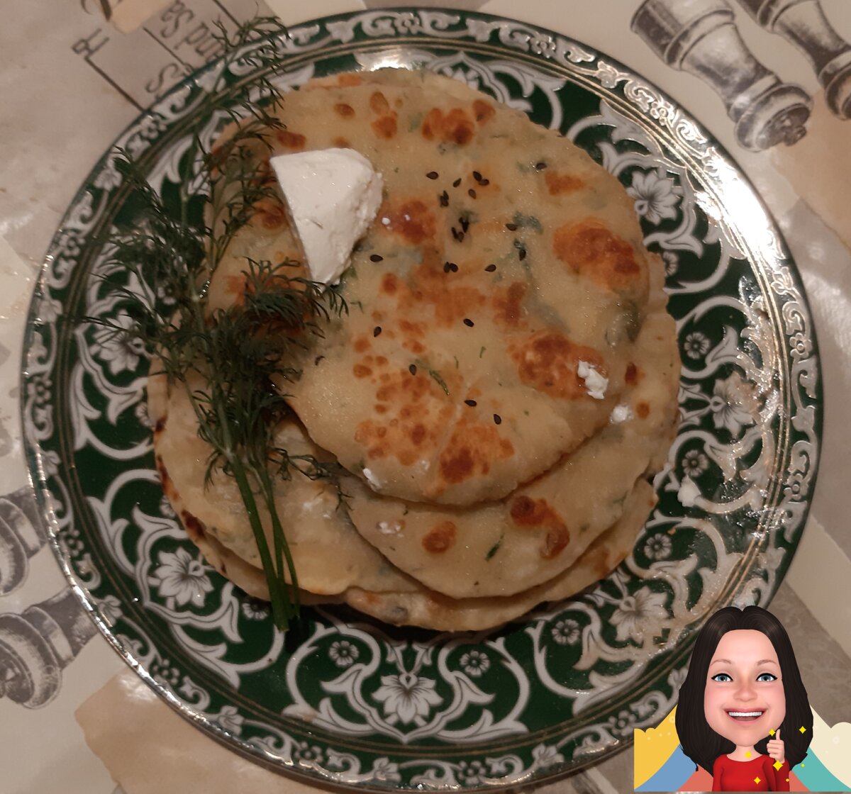 Пока у нас доготавливается основное блюдо (рецепт которого будет в следующей статье), приготовим очень вкусные лепёшки с зеленью. Пекутся они прямо на сковороде. Приготовление займёт минимум времени. Все очень просто 😃 Ингредиенты: Сметана 300 грамм Растопленное масло 50 грамм Одно яйцо Соль 0,5 чайной ложки Сахар 3 ст. Ложки Мука 500 грамм Зелень (у меня базилик, кинза, укроп) Смешиваем сметану, масло, соль, сахар, яйцо и зелень в миске Добавляем по немногу муку и замешиваем тесто Тесто должно получиться мягким и эластичным Теперь накрываем миску полотенцем и оставляем отдохнуть на полчаса Раскатываем достаточно тонкие лепёшки Разогреваем сковороду и начинаем выпекать лепёшки на сухой сковороде затем вторую сторону Выкладываем готовую лепёшку на тарелку и смазываем с одной стороны сливочным маслом В таком же порядке выпекаем и остальные лепёшки Сверху можно украсить зеленью, кусочком брынзы и посыпать кунжутом Угощайтесь))) ПРИЯТНОГО АППЕТИТА!!!😃 В следующей ста