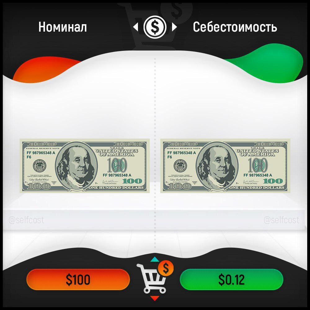 Себестоимость доллара? Каждый год Совет Директоров Федеральной Резервной Системы (ФРС) США, расчитывает примерный спрос на новые банкноты и заказывает их печать в Бюро гравировки и печати при Министерстве финансов. А вот сколько стоит печать каждой банкноты: