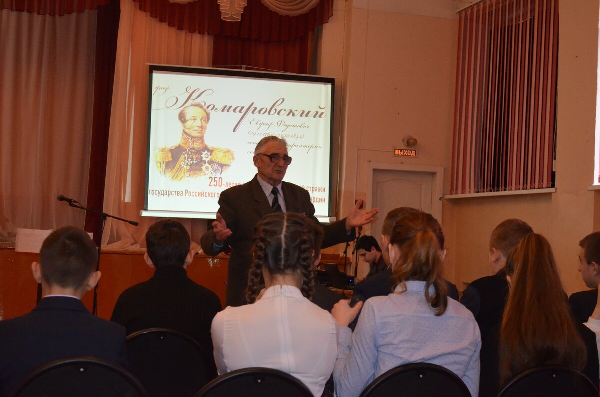 В ходе лекции ветераны рассказали школьникам о жизни генерала от инфантерии графа Евграфа Федотовича Комаровского, свыше 18 лет командовавшего внутренней стражей, которая по праву считается прообразом войск национальной гвардии. Иллюстрацией к занятию стал документальный фильм.