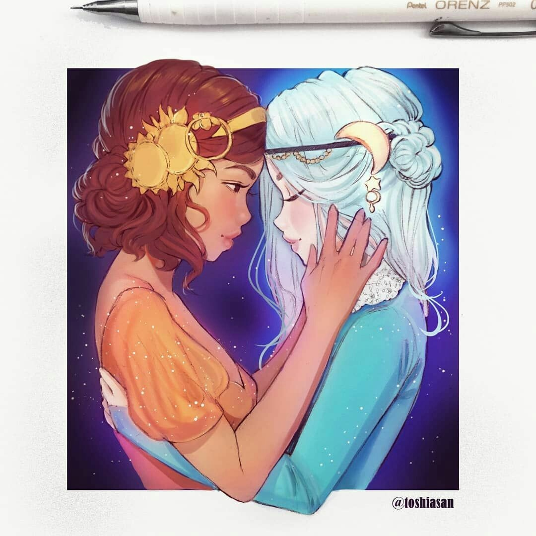 – Он тут стоит, как будто нас ждет, да? – спрашивала Солнце и помогала своей подруге взобраться на крутую лестницу, поддерживая, смотря прямо в эти глаза, что рисовала сотни и сотни раз. Луна смущенно ей кивает и отводит взгляд, не зная, от чего так сильно стучит сердце рядом с этой громкой девчонкой. Просто стучит и поет, словно она обрела давно потерянную сестру.
