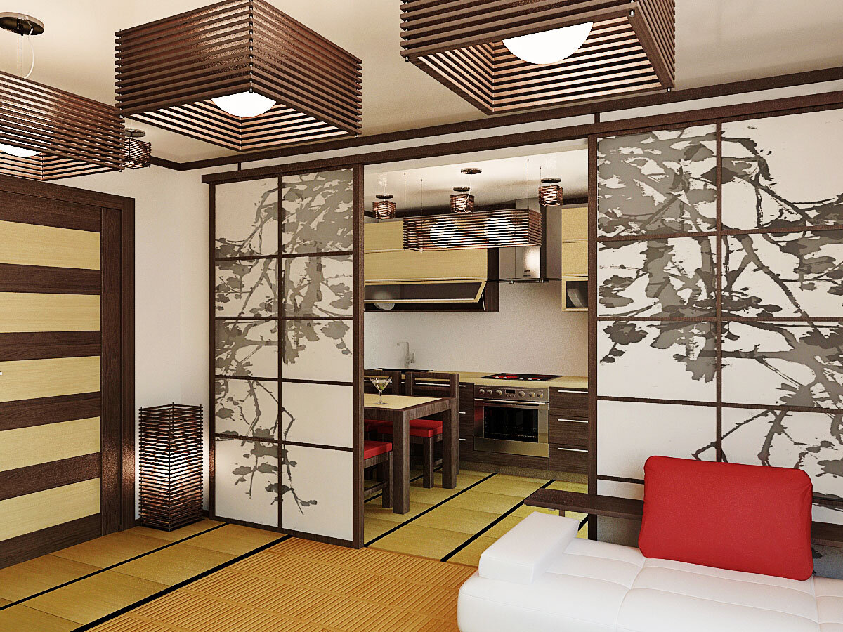 В японском стиле много особенностей. И, на самом деле, он сильно отличается от привычных классических вариантов европейского оформления. Но восток и запад можно примирить. Традиционный стиль Японии диктует создавать над окнами в гостиной выступающие навесы с загнутыми карнизами, что может помочь защитить жилище от косых ливней. Это же влияет на то, что внутри дома создается мягкий полумрак. Но японцы не спешат устанавливать по всему периметру источники света. Совсем наоборот, они воспевают особую эстетику полутемного помещения. Для мягкого освещения применяют светильники акари, состоящие из бумажного плафона. Рассеянный свет, исходящий от них, одновременно и освещает, и сохраняет полумрак. Особенности стиля сводятся и к тому, что в гостиной используется минимум металла. Предпочтение и в мебели, и в декоре отдается дереву и бумаге и в отделке пола, и полотка, и стен. В дизайне интерьера японского жилища преобладают такие материалы как кедр, бамбук, рисовая бумага, плетеная лоза. Здесь