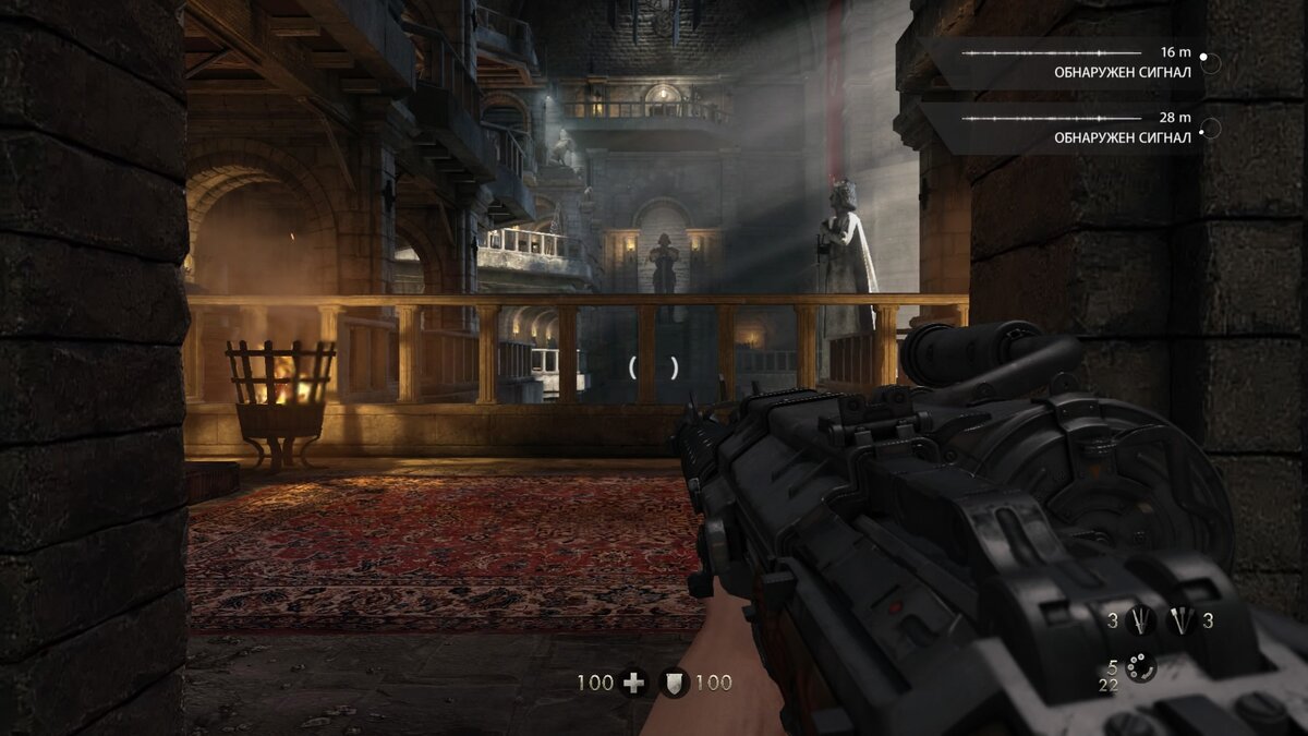 В Old Blood стало гораздо больше гигантских объектов – один замок Вольфенштайн с его системой фуникулеров и гигантскими чего стоит. Внешние размеры намекают на роскошные внутренние интерьеры, которые нисколько не разочаровывают. Люстры, ковры, залы, камины и библиотеки, в которых отлично разлетаются книги при взрыве гранаты – это выглядит просто замечательно. И хочется больше разглядывать, а не стрелять.
