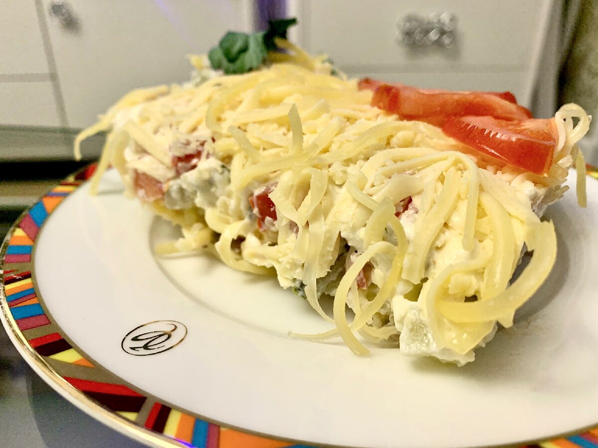 Ингредиенты: ♡ Говядина - 500 гр. ♡ Яйца – 4 шт ♡ Помидоры - 3-4 шт. ♡ Маринованные огурцы - 2-3 шт. ♡ Картофель - 3-4 шт. ♡ Сыр (полутвердый, например "Российский")- 150 гр. ♡ Майонез ♡ Пучок петрушки ♡ Соль и перец Если любите морковь, то можете добавить и ее, так как это рецепт моего любимого салата из ТЦ "Окей", а они явно создали его по рецепту "Петроградского салата" Рецепт: ★ Налейте в кастрюлю воду, посолите и положите в нее говядину. Варите 2 часа, чтобы она стала мягкой ★ Сварите картофель ★ После готовности все ингредиенты выложите перед собой, чтобы было удобнее. ★ Мелко нарежьте все ингредиенты (чем мельче, тем будет вкуснее), посолите и поперчите мясо и картофель ★ Возьмите удлиненную емкость, в которой будете подавать салат и выложите ингредиенты в следующей последовательности: ♡ Говядина ♡ Картофель ♡ Огурцы ♡ Немного сыра (чуть меньше половины) ♡ Немного майонеза ♡ Помидоры ♡ Майонез ♡ Сыр ★ Сверху украсьте помидорами и петрушкой ☆☆☆ Bon