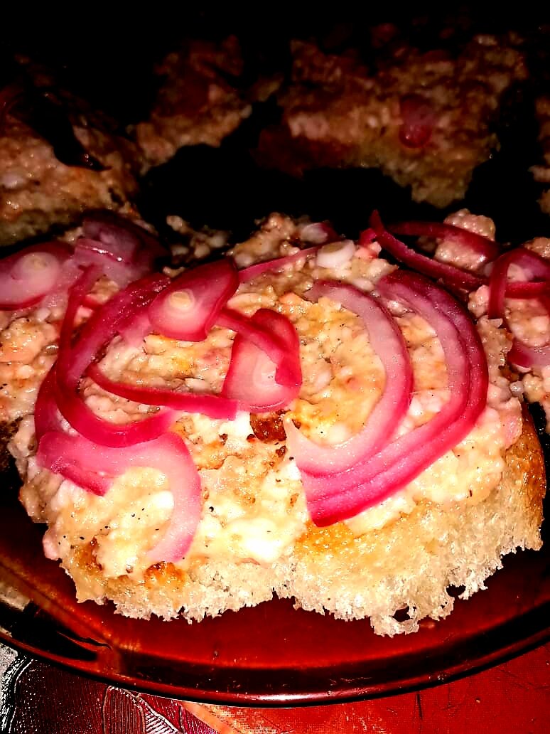 Сегодня приготовила очень вкусные бутербродики, которые часто подаю к борщу и другим первым блюдам. А ещё иногда они выступают отличной закуской на праздничных посиделках с крепкими напитками. Рецепт простейший-результат восхитительный!!! Итак, приступим. Нам нужно: и 3 кусочка белого. Сначала обжариваем хлеб на слегка смазанной маслом сковороде. Можно и без масла. Если я делаю бутерброды для закуски, то хлеб сразу режу на кусочки "на один укус". Это очень удобно. Сегодня я резала довольно крупными кусками, так как делала их к супчику. Режем лук полукольцами как можно тоньше. Заливаем кипятком на несколько секунд, сливаем и тут же заливаем холодной водой, добавляем туда по щепотка соли и сахара, и чайную ложку уксуса. Ставим лук залитый водой в морозилку на несколько минут. Это нужно для того, чтобы лук был хрустящим, но не горьким. Кстати, также я готовлю лучок к жареному мясу или шашлыку. Очень вкусно и красиво разложить его сверху на мяско,естественно предварительно отжав,ил