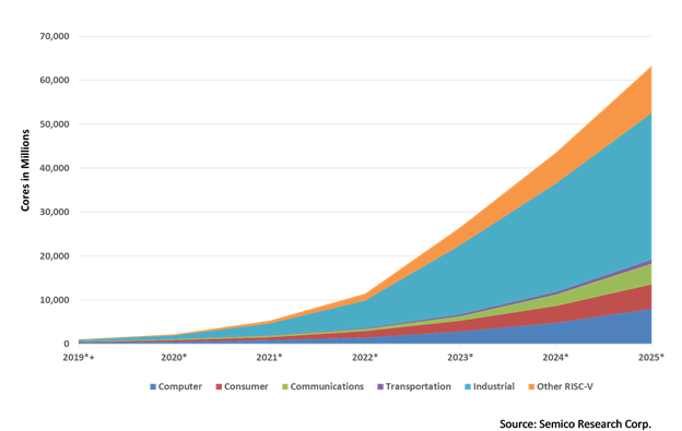 Аналитическая компания Semico провела анализ информации по 25 прикладным сферам использования вычислительных ядер на открытой архитектуре RISC-V для пяти главных рынков готовых решений: компьютерного, потребительского, связи, транспорта и промышленного. На основе полученных данных Semico представила прогноз поставок на рынок разнообразных ядер RISC-V до 2025 года. По мнению специалистов, среднегодовой рост поставок начиная с 2018 года составит 146 % или 62,7 млрд ядер в год к концу прогнозируемого периода. Наибольший сегмент будут удерживать ядра RISC-V для промышленного оборудования и промышленности в целом, что выразилось в предсказании поставок для этих целей 16,7 млрд ядер к 2025 году. Но самый бурный рост поставок ядер RISC-V со среднегодовым ростом на уровне 209 % предсказан в категории связи. Это аналитики объясняют ожиданием всплеска и развёртыванием сетей сотовой связи поколения 5G. Такому росту будут способствовать как продукты, так и инфраструктурные решения 5G. Следом за к