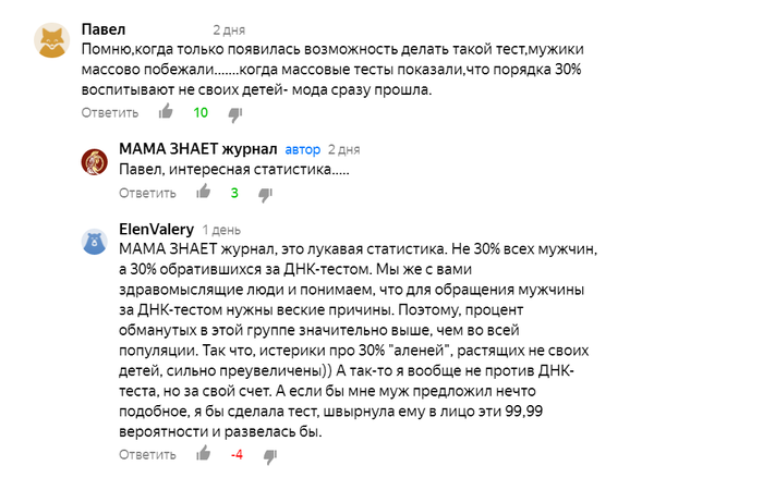 Наткнулся на занятный комментарий женщины в теме, в которой в очередной раз подымался вопрос об обязательном установлении родства для обоих родителей при выписке из роддома. Женщина согласна, что факт воспитания чужих детей мужем имеется. Женщина согласна, что 30% подозрений со стороны мужей оправдываются. И тут же заявляет, что при такой огромной вероятности раскрытия подлога, она разведется с мужем в случае его обращения за тестом, не забывая дать ремарку что ребенок конечно от мужа. Что это если не семейный терроризм, призванный скрыть факт обмана своего мужа? В очередной раз я обеими руками за обязательное установление родства! Все таки изменщицам клеймо на лоб пока не ставят! А что Вы думаете по данному поводу, уважаемые читатели?