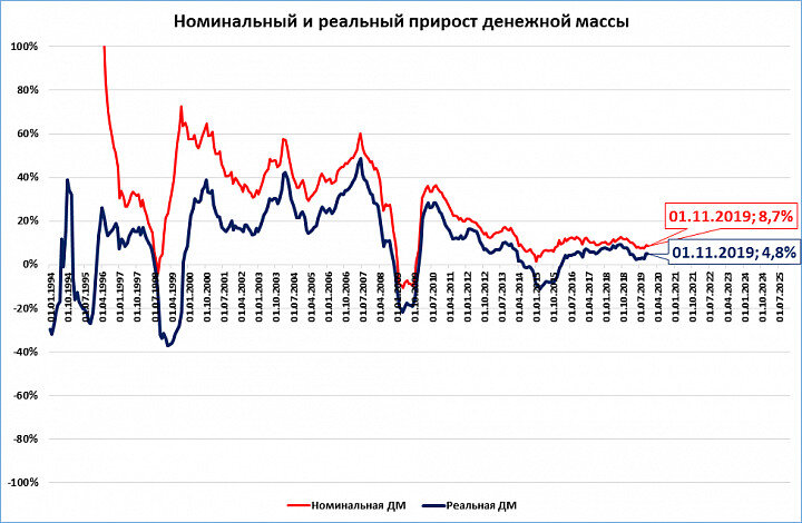 ЦБ опубликовал данные по денежной массе на 1 ноября. Денежная масса выросла на 8,7% за год в номинальном выражении. В реальном выражении (с учётом инфляции) рост составил +4,8% (месяцем ранее темп был +4,9%). График 1. Низкие темпы роста реальной денежной массы наблюдаются в России с 2012 года Среднегодовые темпы реальной денежной массы показаны на графике 2 (тёмно-синяя линия). График 2. Денежный светофор по прежнему на «жёлтом» На 1 ноября эти темпы опустились до 4,1% (с 4,4% месяцем ранее). При продолжении сложившейся тенденции, они опустятся к концу года до 3,7% (месяц назад ожидалось 3,6%). По «таблице умножения ВВП»* таким темпам реальной денежной массы соответствует рост ВВП на 0,7…0,8% Таблица умножения ВВП Мы пересматриваем свой прогноз ВВП по итогам 2019 года на 0,7…0,8% (предыдущий прогноз 0,7%). На графике 3 показаны и темпы РДМ (по левой шкале), и соответствующие им темпы ВВП (по правой шкале). График 3. Темпы ВВП примерно в 5 раз меньше темпов РДМ. Соотношение темпов