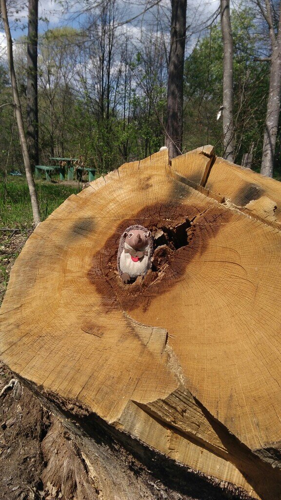 Упал старый дуб, мимо которого Ёжик ходил на речку. Когда дуб ещё был жив, Ёжик думал, сколько же ему лет, какой он здоровенный! Дуб засыхал постепенно, но стоял еще очень долго... И вот настал тот день, когда он просто рухнул, и лесники распилили его, чтобы он не загораживал проход. Ёжик помнил, что возраст дерева можно узнать, подсчитав кольца, которые остались после спила. Это правда, грустно, но другого способа узнать нет. И Ёжик стал считать, но было очень сложно. Расстояние между некоторыми кольцами было столь узкое, что становилось не понятно, сколько же там колец. Ёжик знал, что по кольцам дерева можно определить не только его возраст, но и то, как дерево жило, что происходило с ним и с природой. Например, если расстояния между колечками были узкие, то это говорило о том, что лето и весна были засушливыми, и рост дерева замедлялся. Если же широким , то дерево росло хорошо, а следовательно и погода была комфортной. Также можно было определить, какие случались события, например,