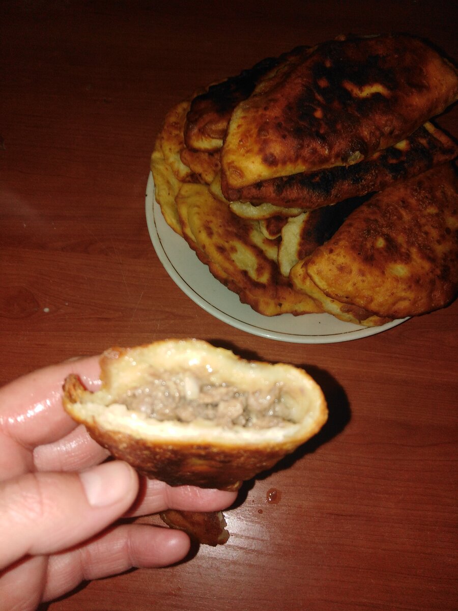 В интернете попался рецепт сырных лепешек, несложный, бюджетный такой рецепт. Моим очень даже понравились эти лепешки. Тут я решила поэкспериментировать и сделать их с начинкой из мясного фарша. Фарш говяжий с луком, чесноком, солью и перцем. Ну и тесто замесила как на сырные лепешки, если надо вот ингредиенты; ст. кефира, пол чайной ложки сахара, соли и соды. Замешиваем всё и добавляем стакан муки, после путем размешать всё и натереть туда сыр грамм 150. И замешиваем дальше с мукой пока не перестанет липнуть к рукам. Получилось у меня наподобие чебуреков, кстати прожаривать их надо путем, так как фарш внутри сырой. Мне пришлось обжаривать два раза) В целом получилос