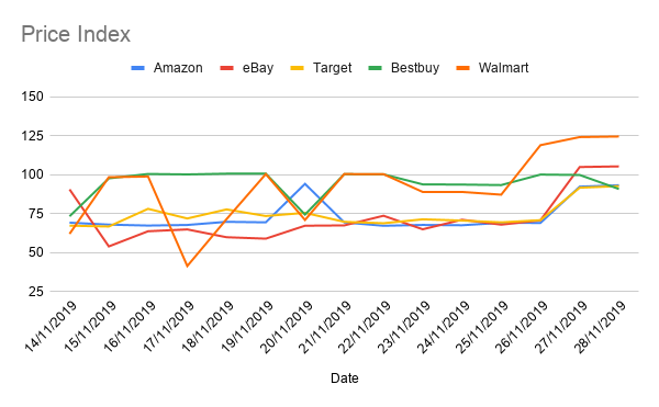 Безумие Черной пятницы почти начинается, и мы хотели поделиться анализом ценообразования в интернет магазинах. Эта методология исследования была основана на ассортименте продукции Amazon, и мы не имеем никакого отношения или связи с Amazon в каких-либо условиях. Единственная причина, по которой мы выбрали их ассортимент, заключается в том, что у них самый большой размер запасов, что повышает точность нашего подхода сверху вниз. Цены растут перед Черной пятницей! Как вы можете видеть из графика выше, топ-5 ритейлеров увеличили свои цены за 2-3 дня до Черной пятницы. Amazon и Target сравнили свои цены друг с другом, и Bestbuy присоединился к игре в последнюю минуту. Walmart кажется, что они готовятся к большим скидкам. Видеоигры имеют самую высокую конкуренцию В то время как Amazon и eBay установили свои цены близко к среднему (индекс: 100), Target и Bestbuy собираются за самые низкие цены в категории видеоигр. Walmart проводит свою общую стратегию в этой категории. Популярный бренд: N